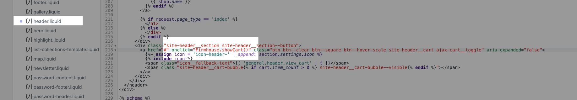 First you need to locate where your Cart button is loaded in. Typically this will be in `header.liquid` of your Shopify theme.